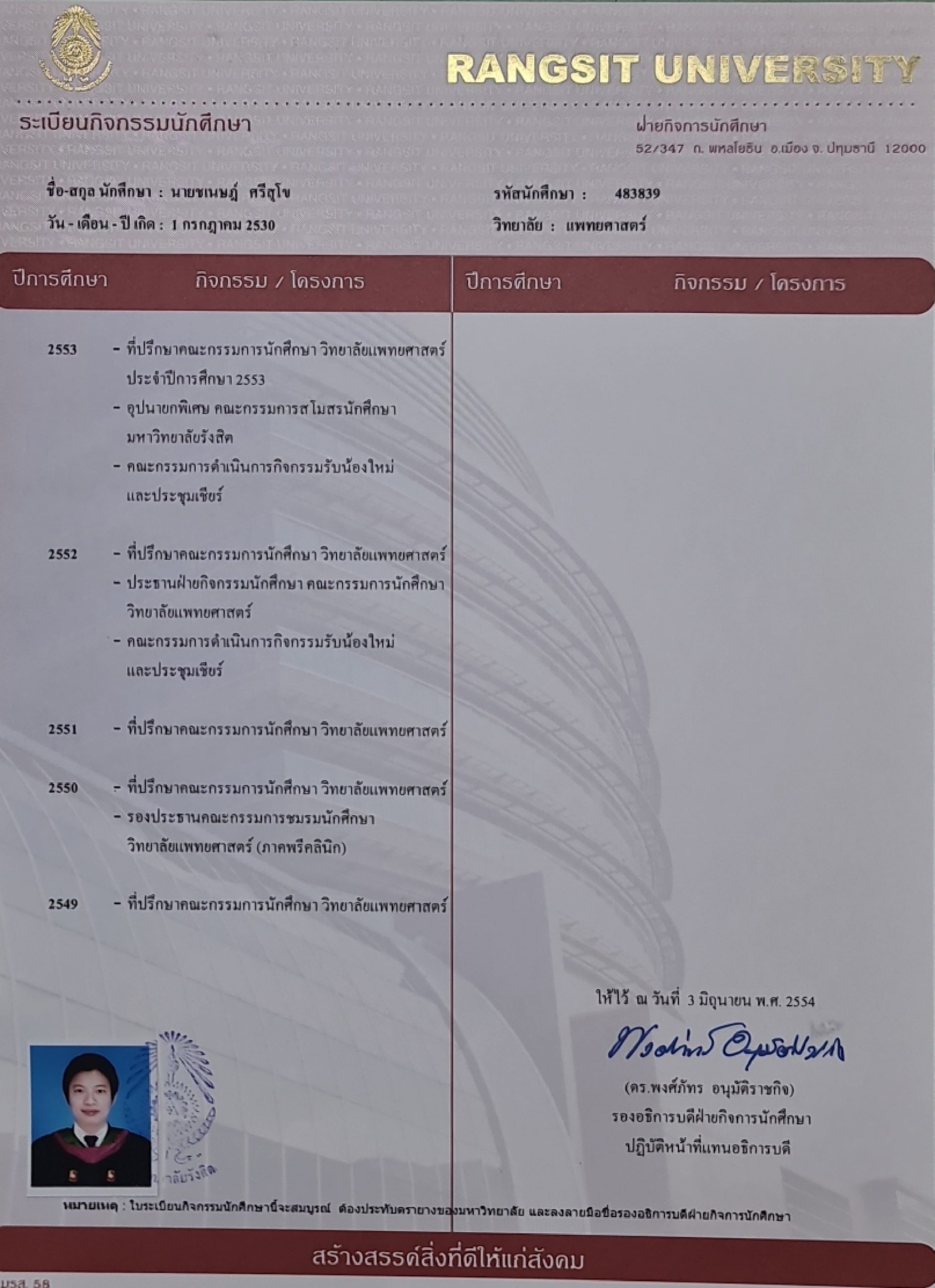 - นักศึกษาแพทย์ ปฏิบัติงานที่ โรงพยาบาลราชวิถี, โรงพยาบาลศรีมหาโพธิ์, โรงพยาบาลกบินทร์บุรี ปี 2551-2553