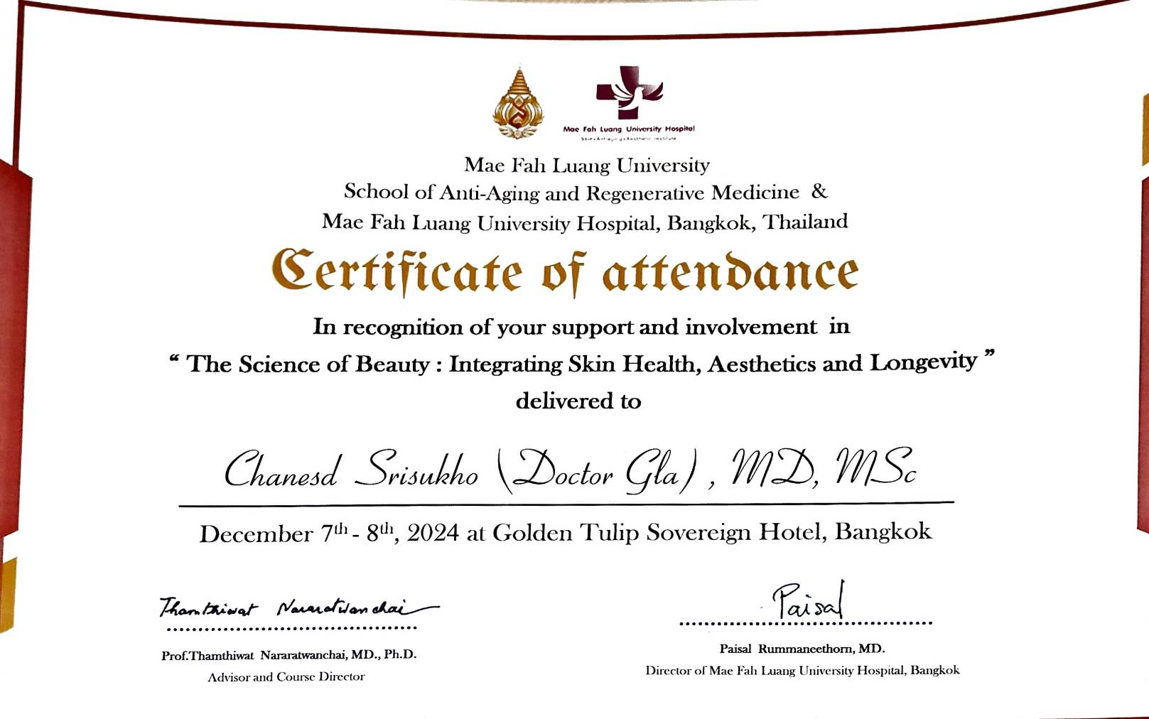 - certificate of attendance to “Focus to the Future of Anti-Aging Refenerative & Aesthetic Medicine 2014” of Thai Association of Anti – Aging and Regenerative Medicine (TAARM)
