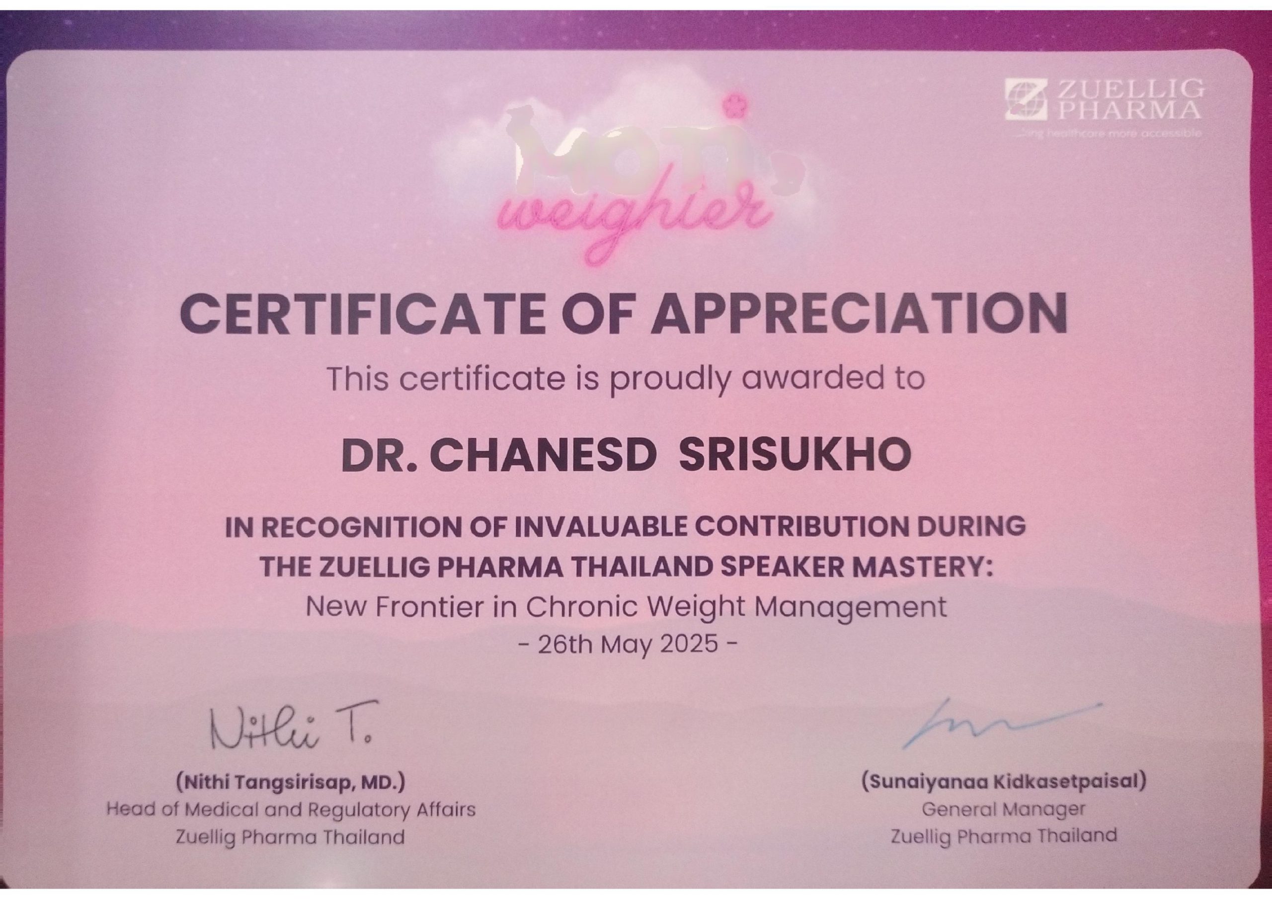 Certificate: Moti-Weightor (Motivator) in the speaker bureau event, Thailand, speaker mastery