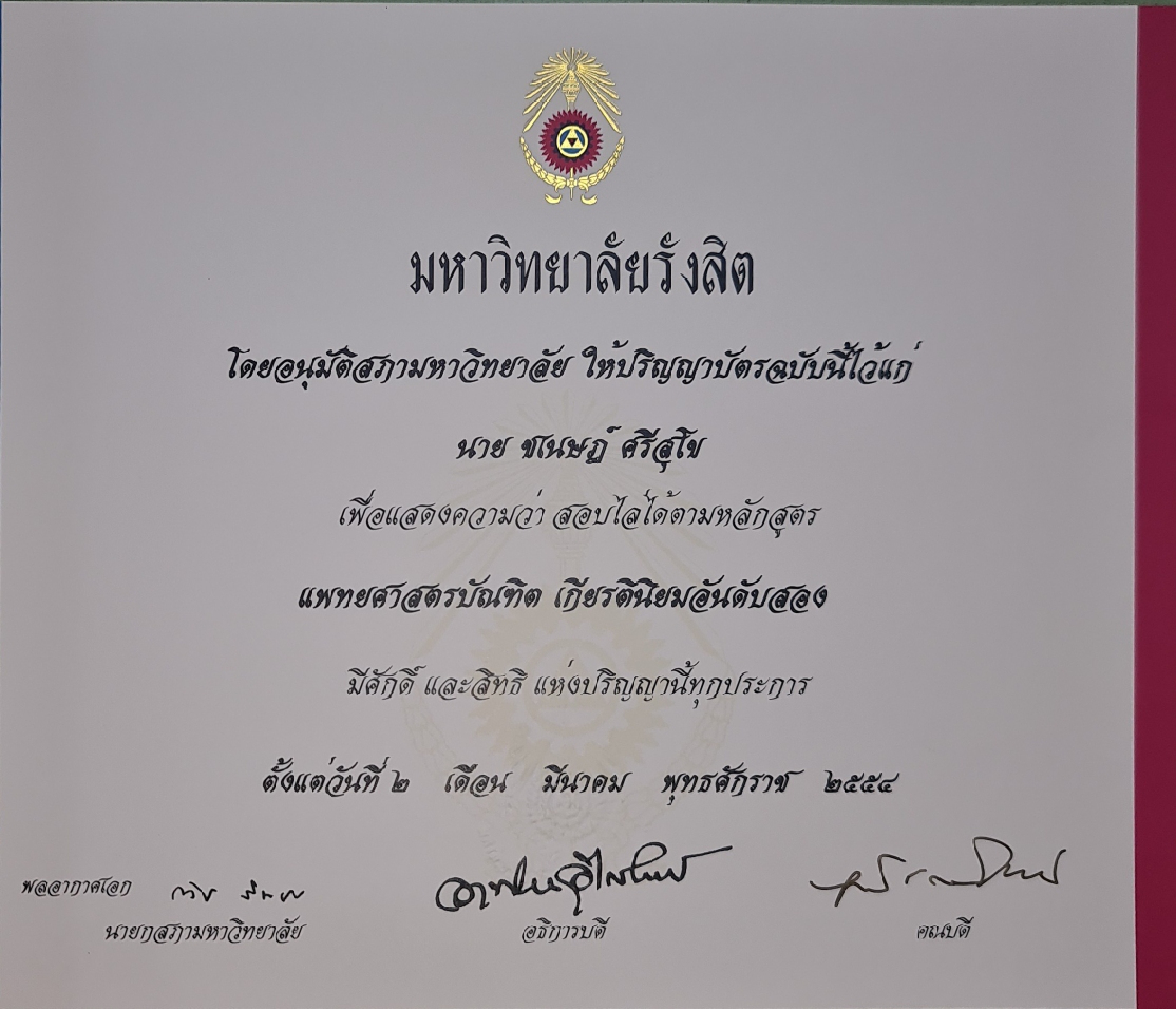 - เกียรตินิยมอันดับสอง (GPA 3.49) แพทยศาสตรบัณฑิต