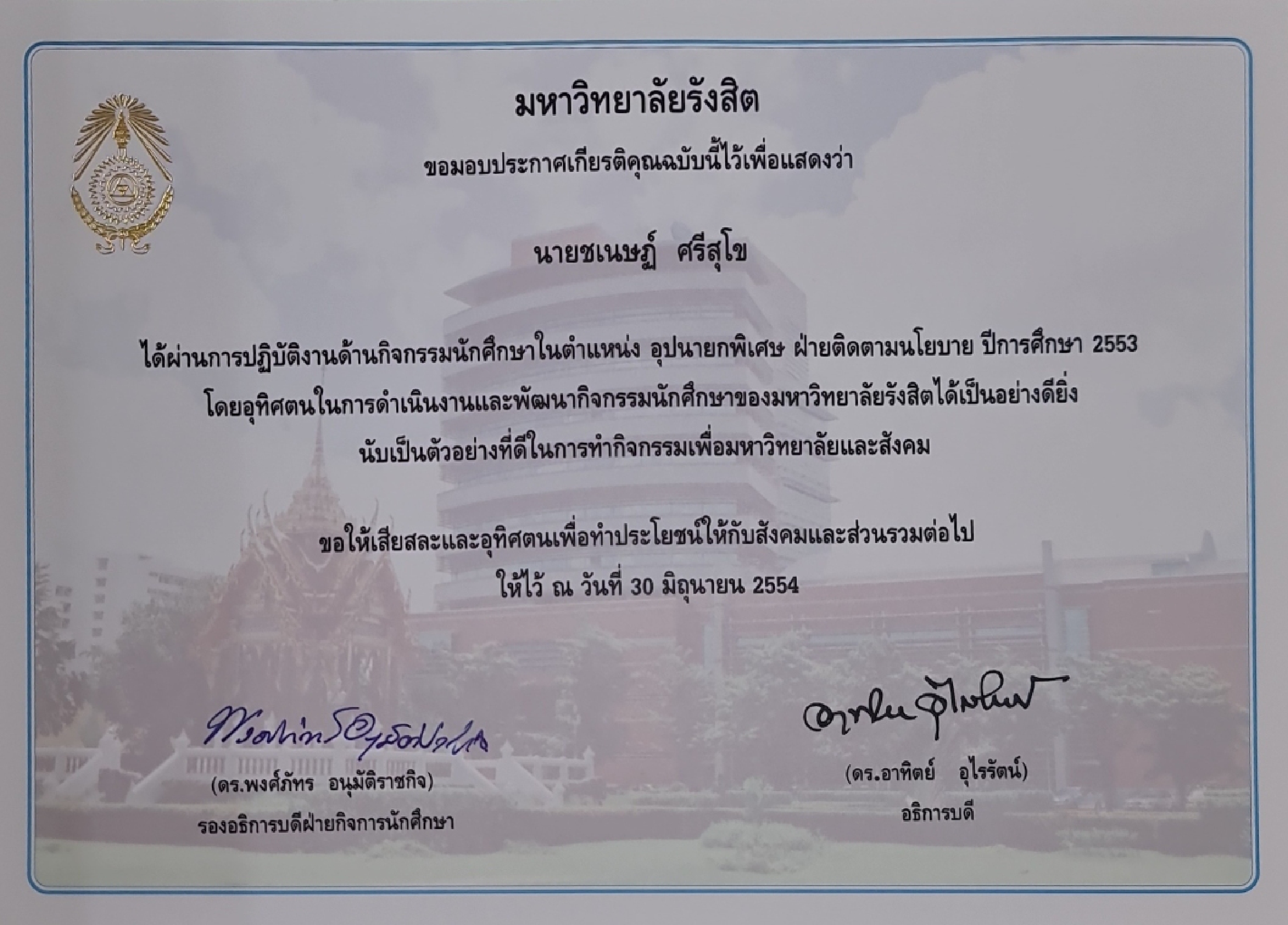 - เกียรติบัตรสอบได้คะแนนเฉลี่ยสูงสุด ภาควิชาศัลยศาสตร์ ประจำปีการศึกษา 2551-2552 สถาบันร่วมผลิตแพทย์ กรมการแพทย์-มหาวิทยาลัยรังสิต